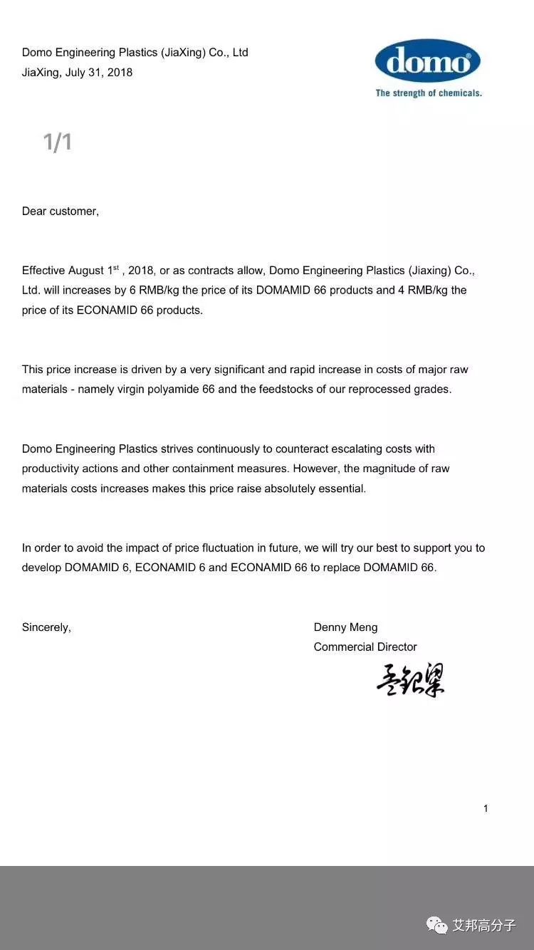7月31日,道默工程塑料(嘉兴)有限公司宣布:由于主要原材料成本的显著增长,自8月1日起,在合同允许下,公司DOMAMD 66 产品价格上涨6RMB/kg,ECONAMID 66产品价格上涨4RMB/kg。