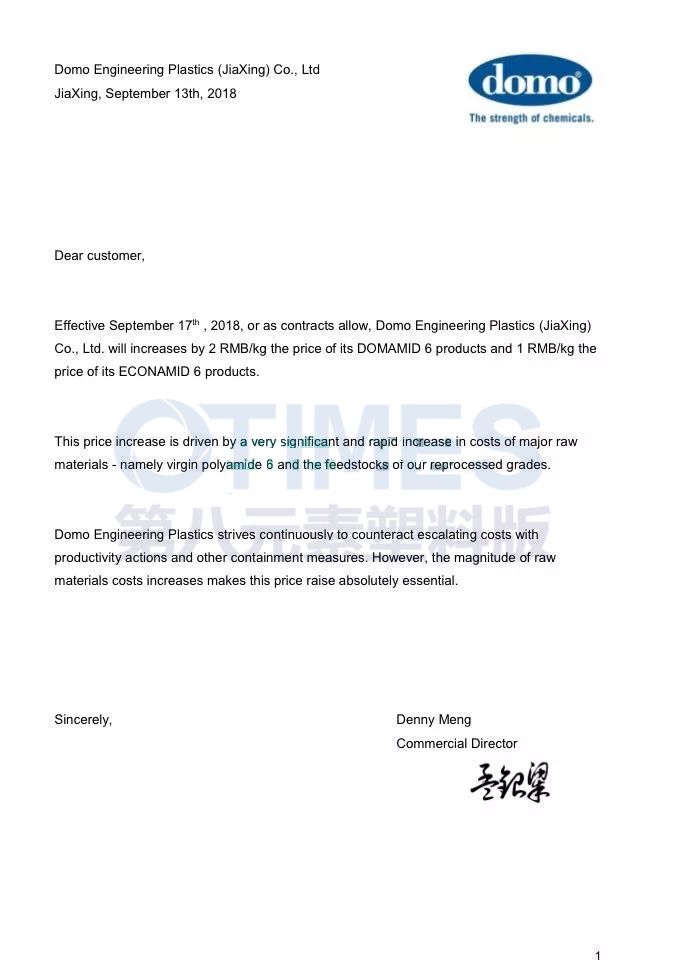 自2018年9月17日起,或在合同允许的情况下,道默工程塑料(嘉兴)有限公司的DOMAMID 6产品价格将增加2元/公斤(相当于上涨2000元/吨),其ECONAMID 6产品价格将增加1元/公斤(相当于上涨1000元/吨)。