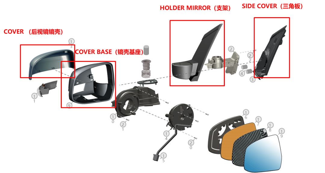 一个典型的外后视镜由将近20个零部件组成,其中用到塑料材料的主要有后视镜镜壳、镜壳基座、支架及三角板。