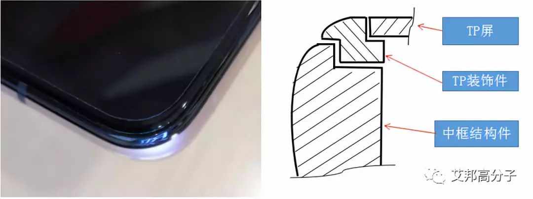 如左图OPPO Reno整机架构是经典的“三明治”结构,即TP2.5D玻璃+TP装饰件+中框+电池盖3D玻璃方式,如右图为TP超窄边的结构示意图,中框和TP装饰件及TP装饰件和TP屏幕都是通过点胶贴合,超窄边框对于点胶工艺是一个极限挑战。