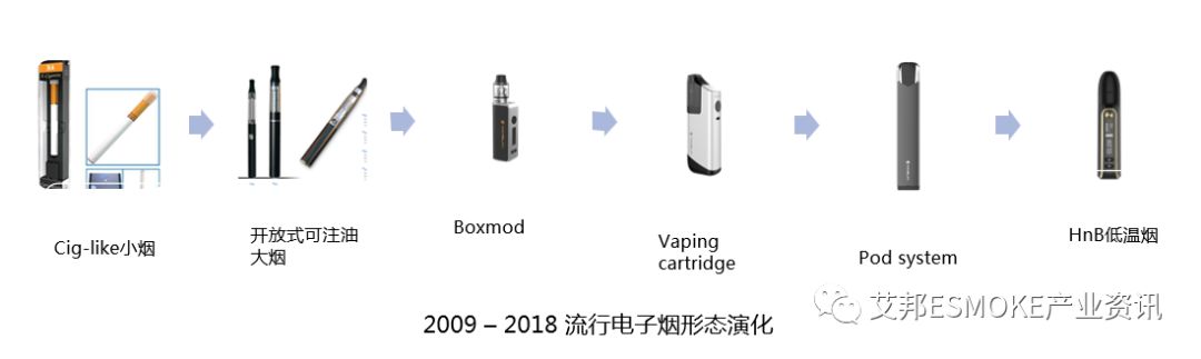 电子烟(e-cigarette)又名虚拟香烟、电子雾化器。随着技术的迭代更新,电子烟已经历多次形态结构演变。电子烟主要分为小烟、大烟及低温干烧型(加热不燃烧)电子烟。小烟及大烟均为蒸发烟雾型,小烟的市场在广大烟民,大烟的市场在电子烟玩家或爱好者。小烟的代表是JUUL,加热不燃烧电子烟的代表是菲利普莫里斯国际推出的IQOS。