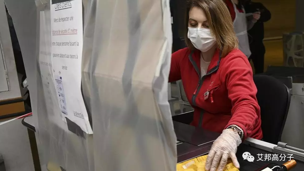 2020年3月19日,在斯特拉斯堡的一家超市里,一名收银员戴着口罩,在塑料布防护后工作