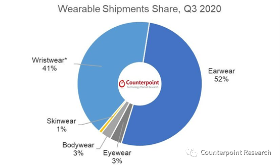 智能穿戴设备市场可细分为五大品类,其中耳机和腕戴设备的市占率最高,共占2020年第三季度总出货量的93%。由于供应商取消了耳机插孔,导致消费者需求改变,耳机市场增长最快。